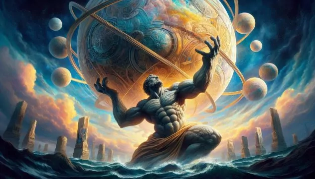 Однією з центральних версій міфу є історія, викладена в «Теогонії» Гесіода, де Атлант описується як один із титанів, що брали участь у війні проти Зевса та олімпійських богів. Після поразки титанів більшість з них були ув’язнені в Тартарі, однак Атлантові дісталося окреме покарання — він був засуджений тримати на своїх плечах небесне склепіння. Це покарання не тільки символізувало величезну провину, а й підкреслювало його силу, витривалість і безвихідь. Атлант стає зразком космічного засудженого — він не вмирає, але його життя — вічне страждання, позбавлене змоги звільнення.