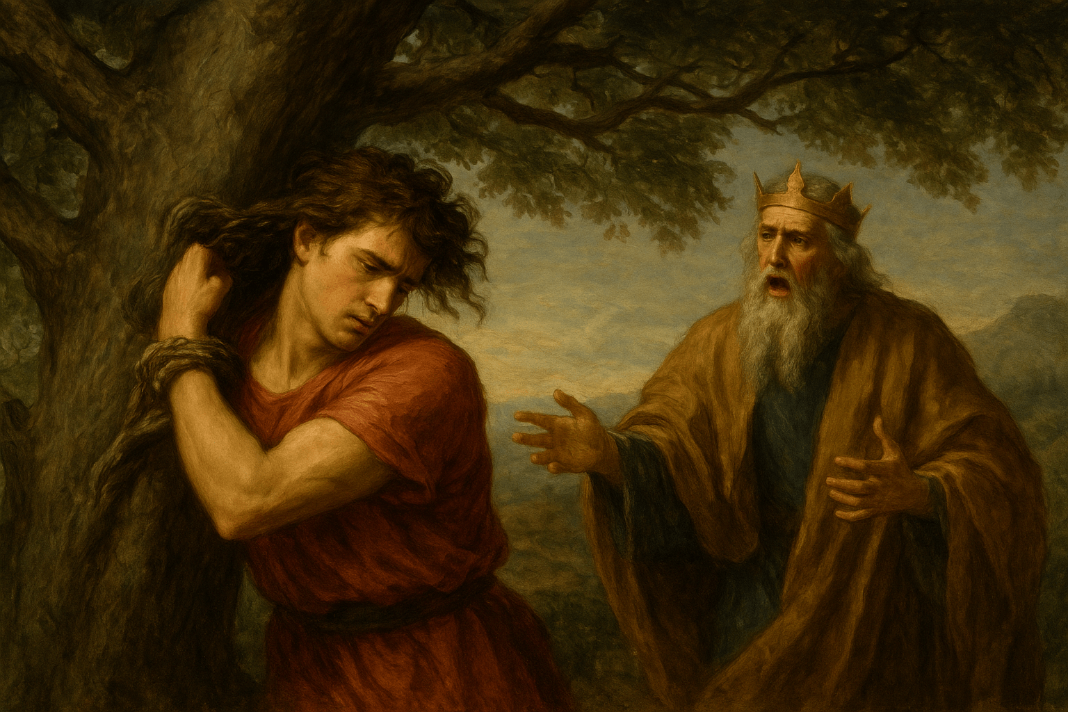 Коли виникли сумніви щодо спадкоємності трону, Авесалом підняв заколот проти свого батька. Він здобув значну підтримку серед ізраїльських племен і навіть захопив Єрусалим, змусивши Давида відступити за Йордан. Протягом певного часу здавалося, що Авесалом зумів утвердитися як новий володар. Його військова кампанія, однак, завершилася поразкою у битві в так званому «лісі Єфрема». Саме там доля зіграла фатальний жарт: під час втечі Авесалом заплутався своїм густим волоссям у гілках дуба й був убитий Йоавом.