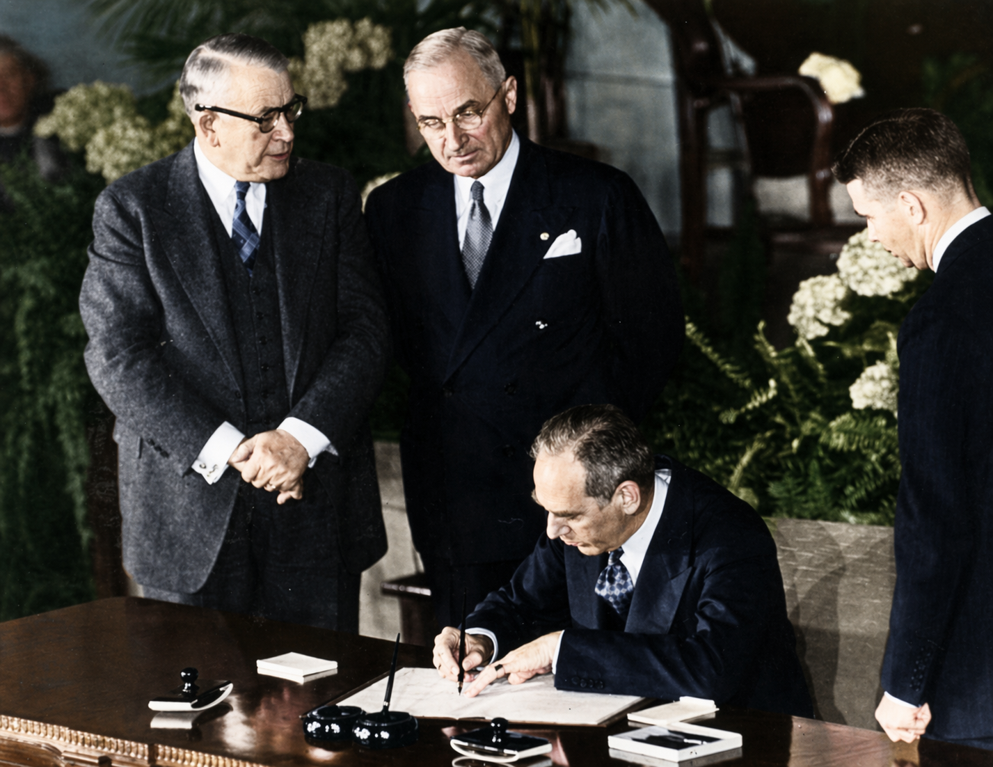 У 1949 році було створено Організація Північноатлантичного договору — перший у мирний час військовий союз США та європейських держав. Його метою стало колективне стримування радянської експансії. Одним із ключових архітекторів цього союзу був державний секретар США Дін Ачесон.