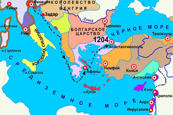 У 1202 році об’єднане військо напало на Задар, головний конкурент Венеції в Адріатичному морі, і захопило його. А в 1204 році хрестоносці взяли і візантійську столицю. Увійшовши в Константинополь, лицарі рушили палаци, будинки, храми, займаючись грабунком. Папа Інокентій III нагадував хрестоносцям про їхню обіцянку звільнити Єрусалим і наклав заборону на похід в Константинополь, але потім він навіть благословив його, оголосивши Балдуїна I Фландрського, хрестоносця, першим імператором новоствореної Латинської імперії в 1204 році.