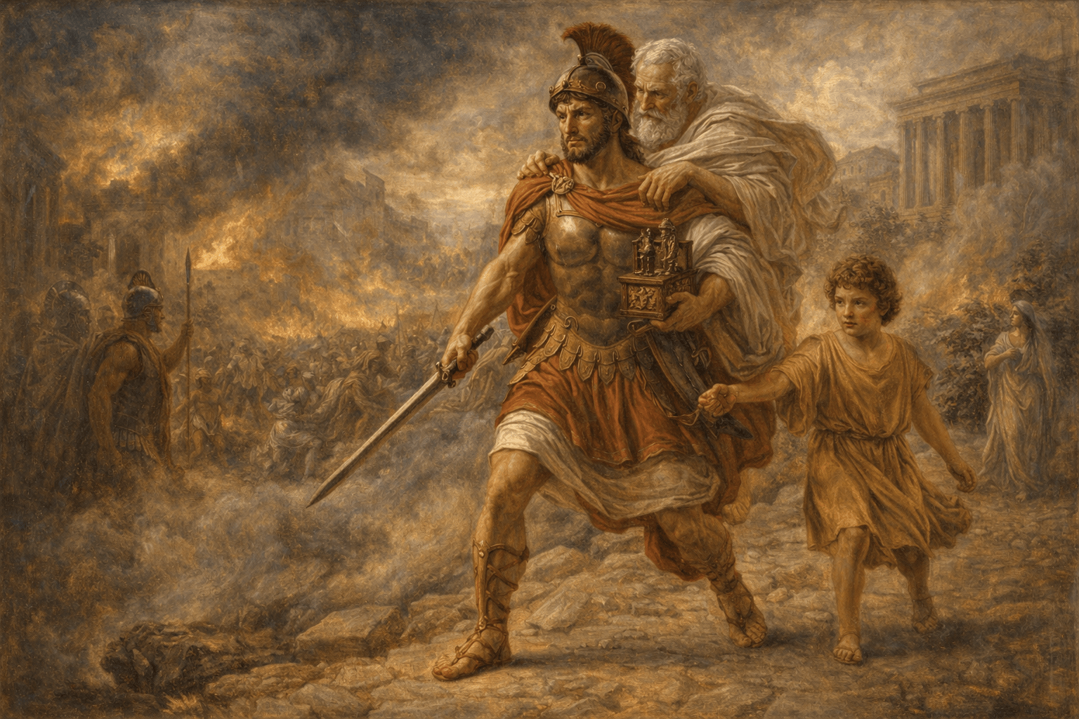 На відміну від багатьох грецьких героїв, які керуються славою чи особистими амбіціями, Еней уособлює інший тип героїзму. Його визначає не стільки сила, скільки здатність підкорятися вищому призначенню. Він жертвує власними почуттями, як у випадку з Дідоною, заради виконання божественної місії. Цей образ відображає ключові цінності римської культури: дисципліну, обов’язок, відданість державі та богам. Саме тому Еней став центральною фігурою римської ідентичності.