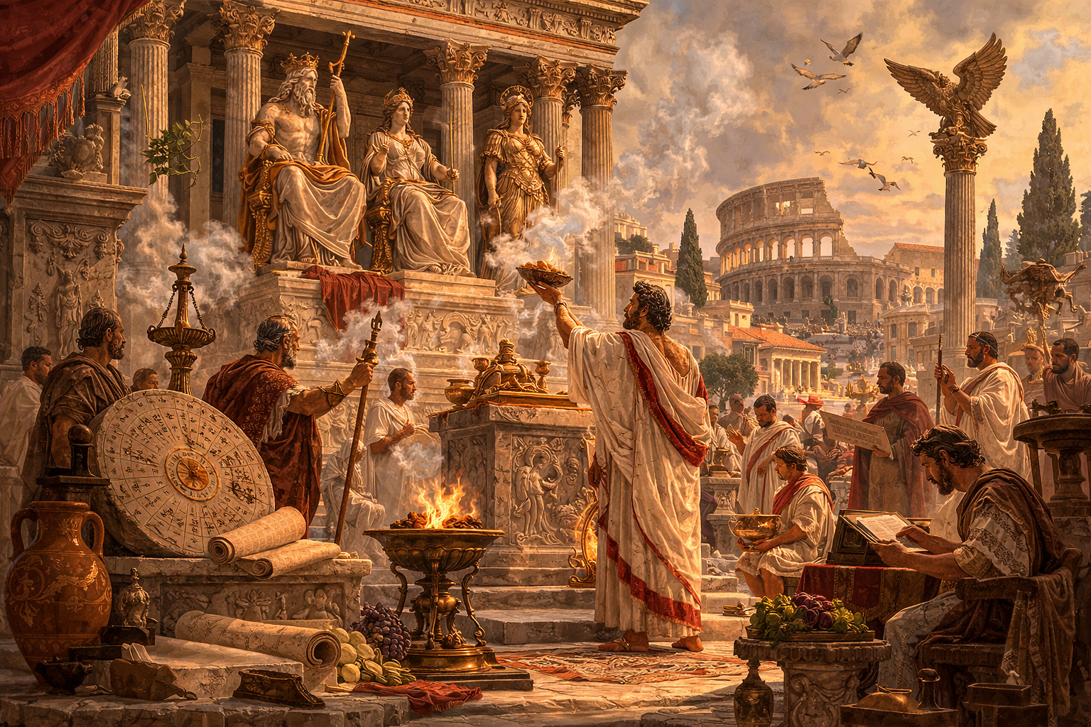 Хоча римляни зберігали власні традиції та певну стриманість у релігійній сфері, вони багато чого запозичили від етрусків. Йдеться не лише про окремі ритуали чи обряди, а про цілу систему культових форм, архітектуру храмів, культові статуї богів і навіть про релігійний календар.