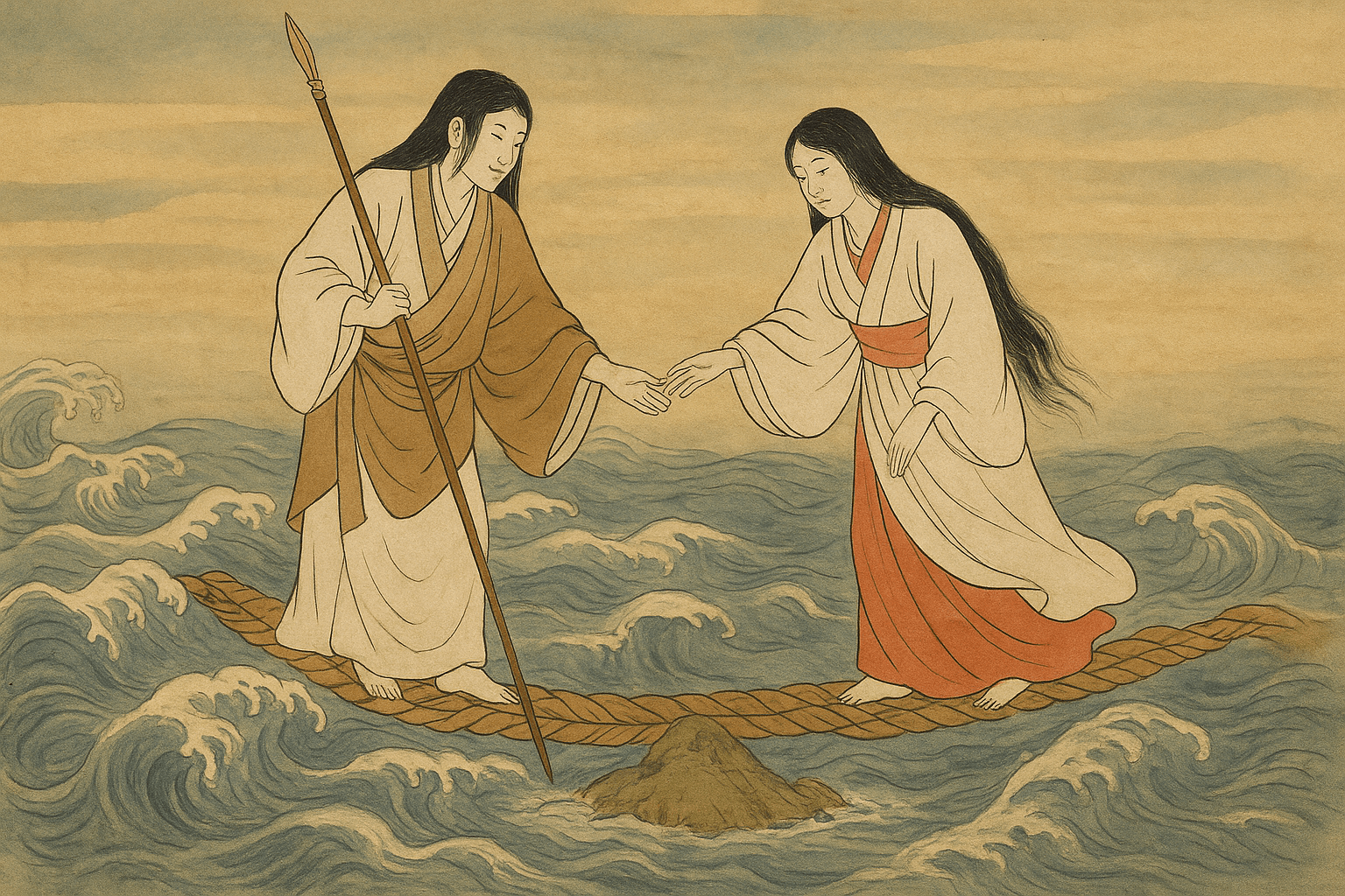 Згідно з давніми текстами Кодзікі та Ніхон Сьокі, саме цій парі було доручено навести лад у безформному світі. Стоячи на «плавучому мосту небес», вони занурили небесний коштовний спис у первісний океан. Коли з вістря списа впали краплі, вони утворили перший острів — початок Японського архіпелагу. Ця дія символізувала народження матерії з хаосу та встановлення космічного порядку.