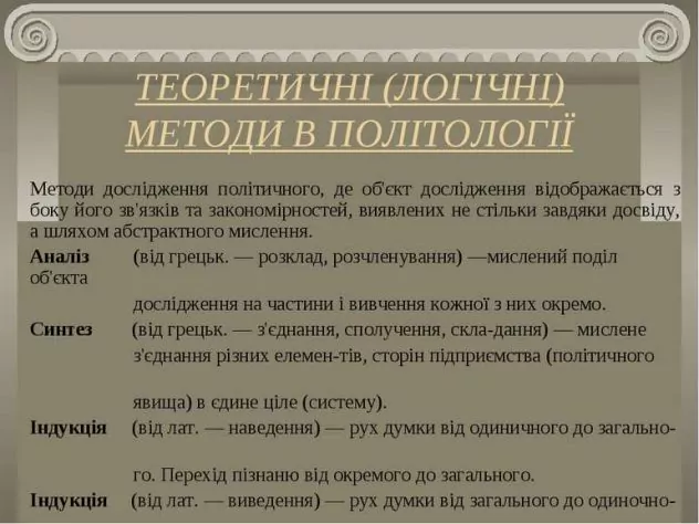- історичний – розглядаються політичні явища через процес становлення минулого і розвиток теперішнього;