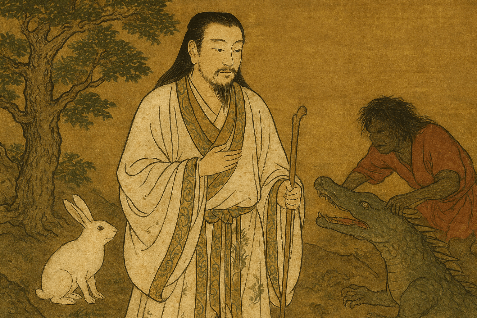 Одним із найвідоміших епізодів є історія з білим зайцем з Інабі. Звір постраждав від крокодила, який обдер його з хутра, та Окунінуші дав йому співчутливу пораду, як вилікуватися. На знак вдячності заєць допоміг йому здобути прихильність принцеси Якамі з Інабі, що стало початком його долі як володаря.