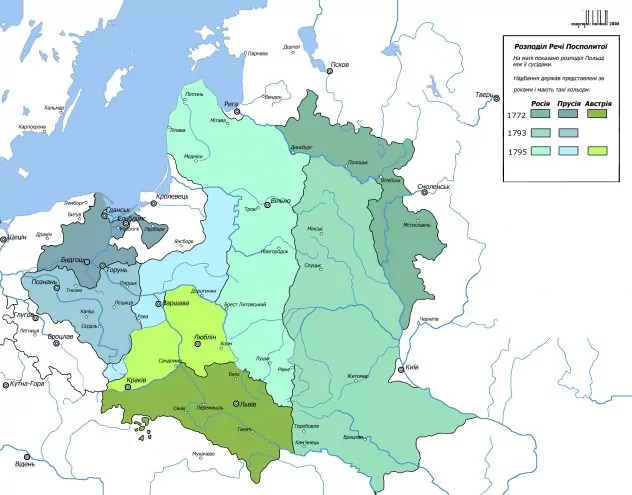 У 1772 році взимку у місті Петербург між Пруссією, Росією, а влітку Австрією був підписаний договір щодо поділу Речі Посполитої. Три армії рушили на Річ Посполиту, котра навіть не очікувала такого удару. Прусське королівство завоювало Поморя ( територія, яка простягалася від міста Гданськ до Торуня). Куяву та Великопольщу (площа – 36 000 квадратних метрів з населенням 580 000 чоловік ), Габссбургзькій монархії дісталася Малопольща та Галиччина, Руське, Белзьке, західні околиці Волинського та Подільського воєводств (загальна площа складає 83 000 квадратних метрів з населенням 2 млн.650 000 чоловік), Російська імперія захопила територію східно-білоруських земель з містами Полоцьк, Вітебськ, Мситиславль, Ліфляндію площею в 92 000 квадратних метрів і населенням – 1 млн. 300 000.