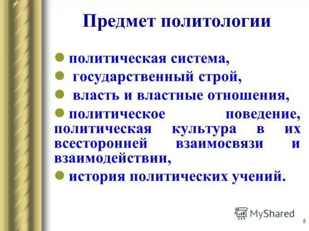 Згідно з Ващенком і Корнієнком, предмет політології вивчає об’єктивні закономірності світового політичного процесу, відносин в країнах, групах держав; класових відносин, міждержавних, між націями, головним завданням якого є утримання, збереження або завоювання влади; способи управління суспільно- політичними процесами. Головним предметом політології є пізнання закономірностей діяльності керівництва та соціального управління на основі публічної влади.