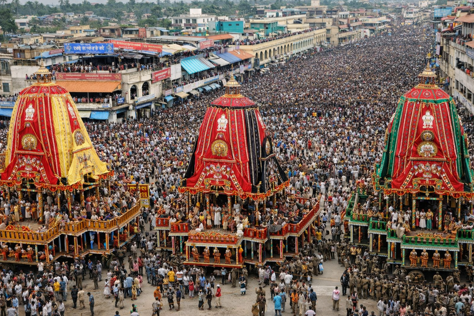 Кожне божество має власну колісницю. Найбільша належить Джаганнатсі та називається Нандігхоша («Крик радості»); вона має шістнадцять коліс. Колісниця Баларами, Таладхваджа («Прапор пальмового дерева»), має чотирнадцять коліс, а колісниця Субхадри, Девадалана («Та, що долає богів»), — дванадцять. Усі ці споруди сягають приблизно 14 метрів заввишки.