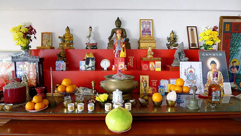 Перед трьома чашками розміщені п’ять тарілок фруктів і п’ять чаш з їжею. Тарілки з фруктами представляють п’ять необхідних елементів (дерево, земля, вогонь, метал і вода) в їх первозданній небесній формі.