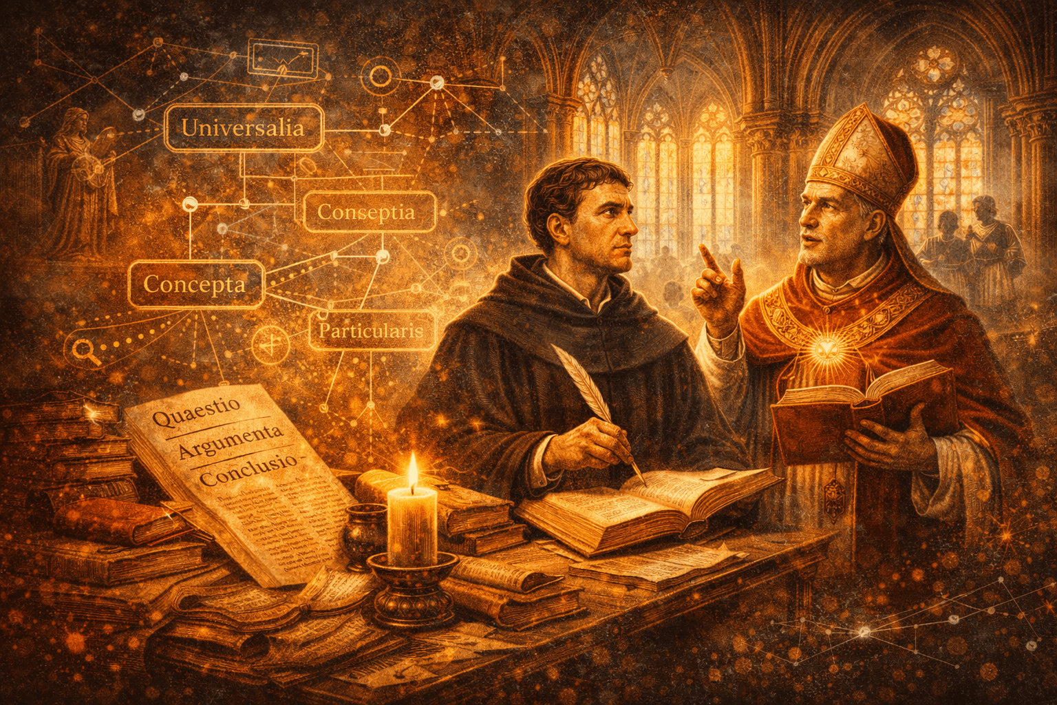 Однією з найвідоміших схоластичних дискусій є суперечка про універсалії — загальні поняття. Чи існують вони реально, чи лише в людському мисленні? Ця проблема мала не лише логічне, а й онтологічне значення, оскільки стосувалася питання буття і пізнання.