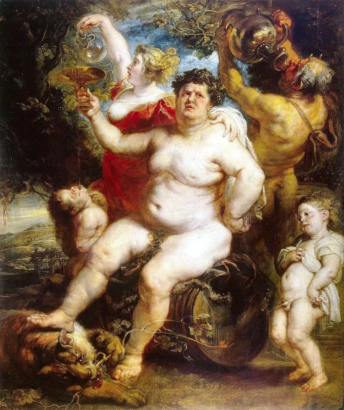Бахусу приписывают открытие вина, и он нес волшебную палочку, известную как «Тирс»: столб укропа с шишкой на конце. Его последователи были известны как менады, а мужчины были сатирами. Они носили шкуры леопарда и несли еловые ветки, обвитые плющом (признаком долголетия). Вакха часто сопровождали сатиры, мужчины с козоподобными чертами, обычно изображаемыми с эрекцией, и женщины-менады, также называемые Вакхами, обычно изображаемые в пьяном танце.